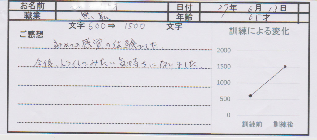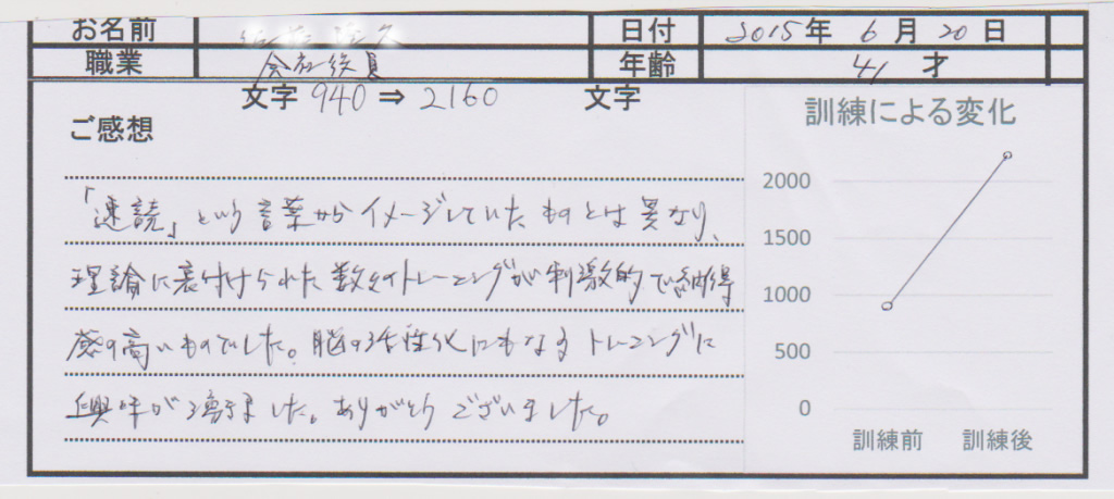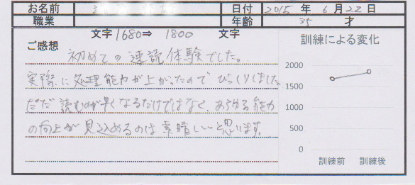 初めての速読体験でした。実際に処理能力が上がったので、びっくりしました。