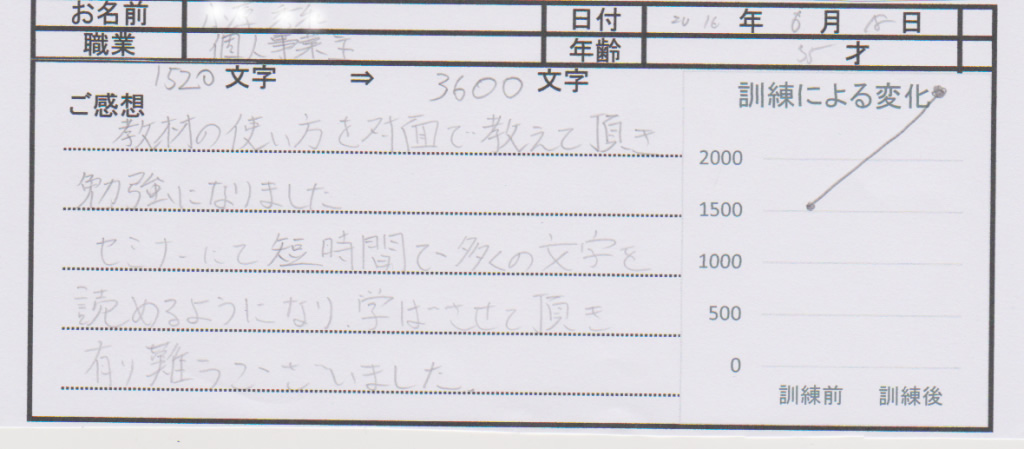 セミナーにて短時間で多くの文字を読めるようになり、学ばせていただきありがとうございました。