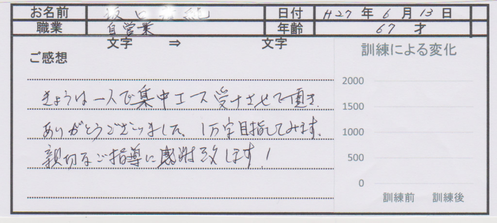 (T.Sさま 67歳 自営業 速読集中コース受講)