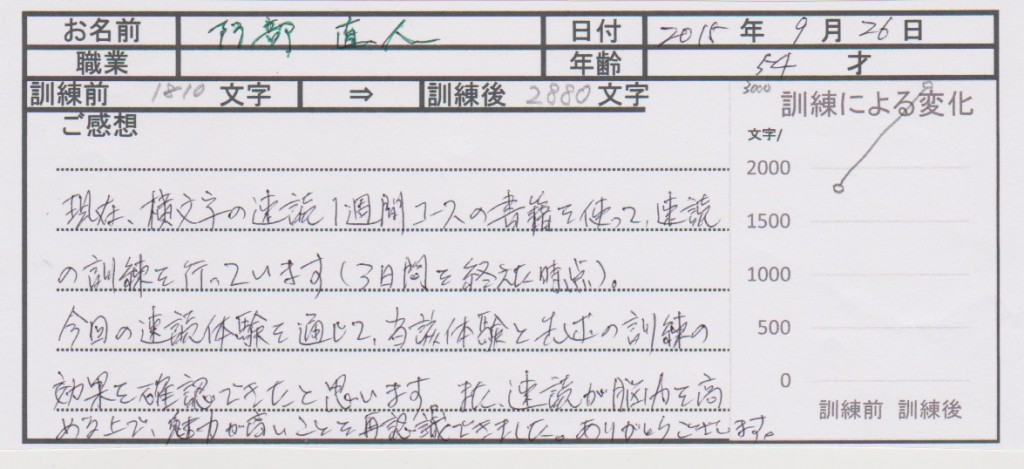 今回の速読体験を通じて当該体験と先述の訓練効果を確認できたと思います。また、速読が脳力を高める上で、魅力が高いことを再認識できました。ありがとうございます。